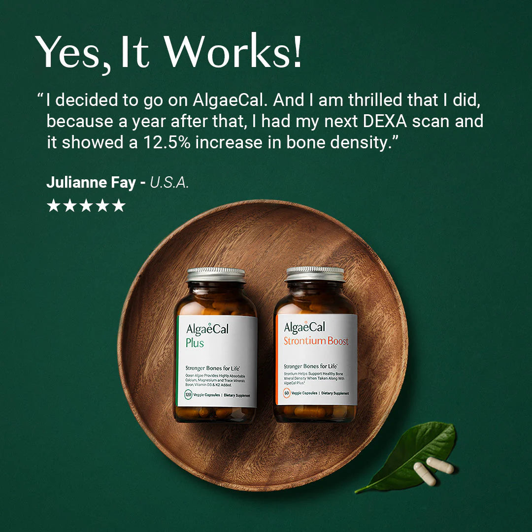 If you are suffering from bone loss, it is best to take both AlgaeCal Plus and Strontium Boost. Together they areclinically supportedto increase bone density in as little as 6 months – at any age! They also increase your bone density at a faster rate than AlgaeCal Plus alone. For example, studies prove AlgaeCal Plus alone can increase bone density by an average of 1.3% per year, compared with an average bone density increase of about 4% per year with AlgaeCal Plus and Strontium Boost together. This is significant for those suffering from bone loss who may be experiencing more than 1% bone density loss per year. Taking the two together also gives the bone-building process a “kick start” to increase bone density safely and naturally, ensuring you have covered any potential losses. Want to hear success stories from real customers?Watch their videos and see before and after DEXA scans here.